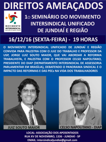 in HOMELeia maisMovimento Intersindical realiza debate sobre “Direitos Ameaçados” Juiz Souto Maior e Celso Natalino, do Diap, vão abordar os ataques com…